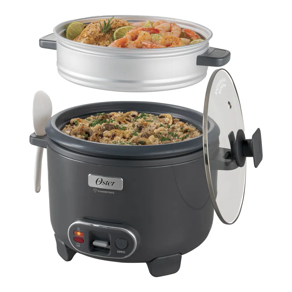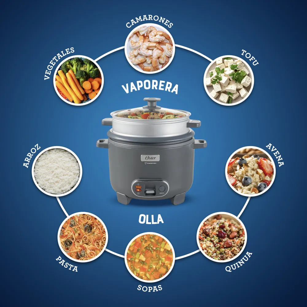 La Oster CKSTRC12DFSKE es una arrocera 3 en 1 diseñada para simplificar la cocina diaria con mayor practicidad y rendimiento. Su capacidad de hasta 12 tazas permite preparar arroz para toda la familia sin que se pegue, gracias al exclusivo recubrimiento antiadherente Oster DiamondForce, que es hasta 15 veces más fácil de limpiar y altamente resistente al desgaste por uso frecuente.