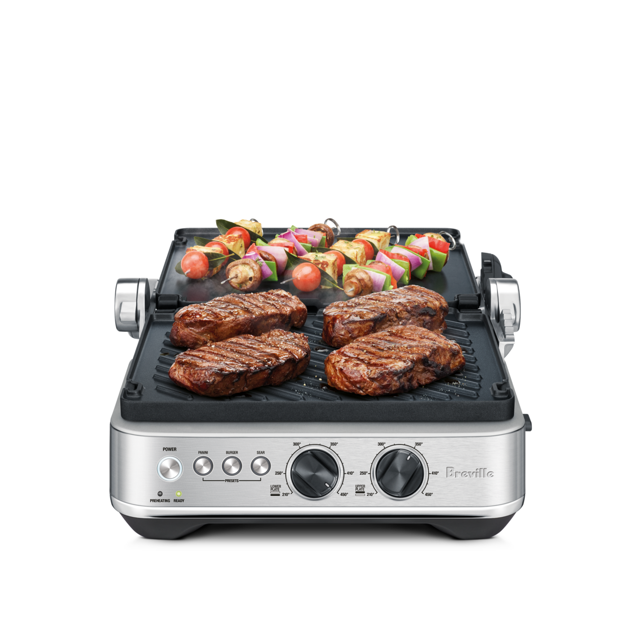 La parrilla inteligente Breville Sear & Press™ modelo BGR700 está diseñada para llevar la cocina a nivel profesional desde tu hogar. Este equipo combina parrilla, plancha, panini press y BBQ en un solo dispositivo, ofreciendo versatilidad total con resultados precisos.