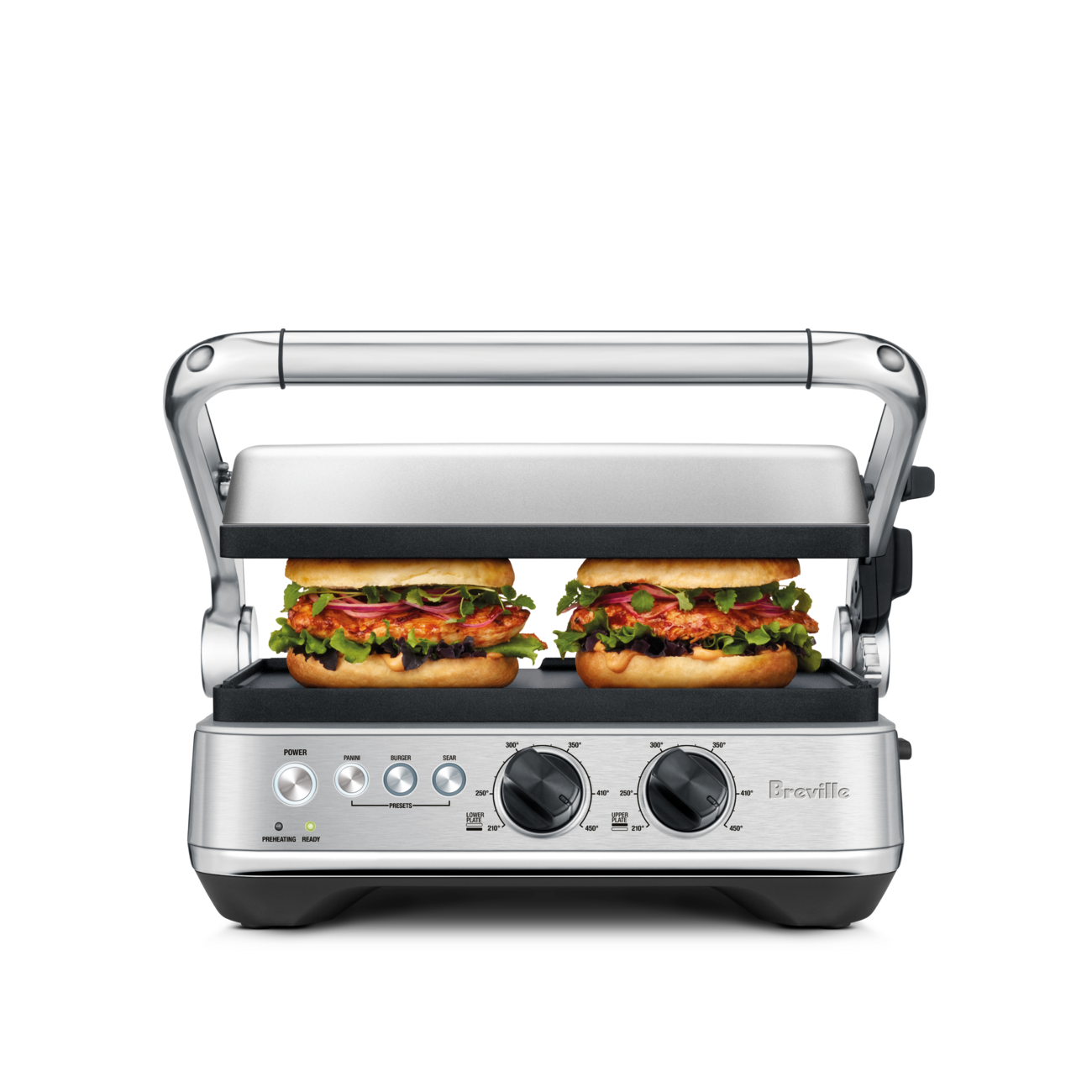 Funciones preprogramadas: Modos como panini, burger y sear optimizan automáticamente el calor para resultados consistentes.