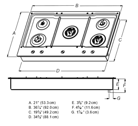 ✓ Plantilla de gas de 36” con 5 quemadores sellados