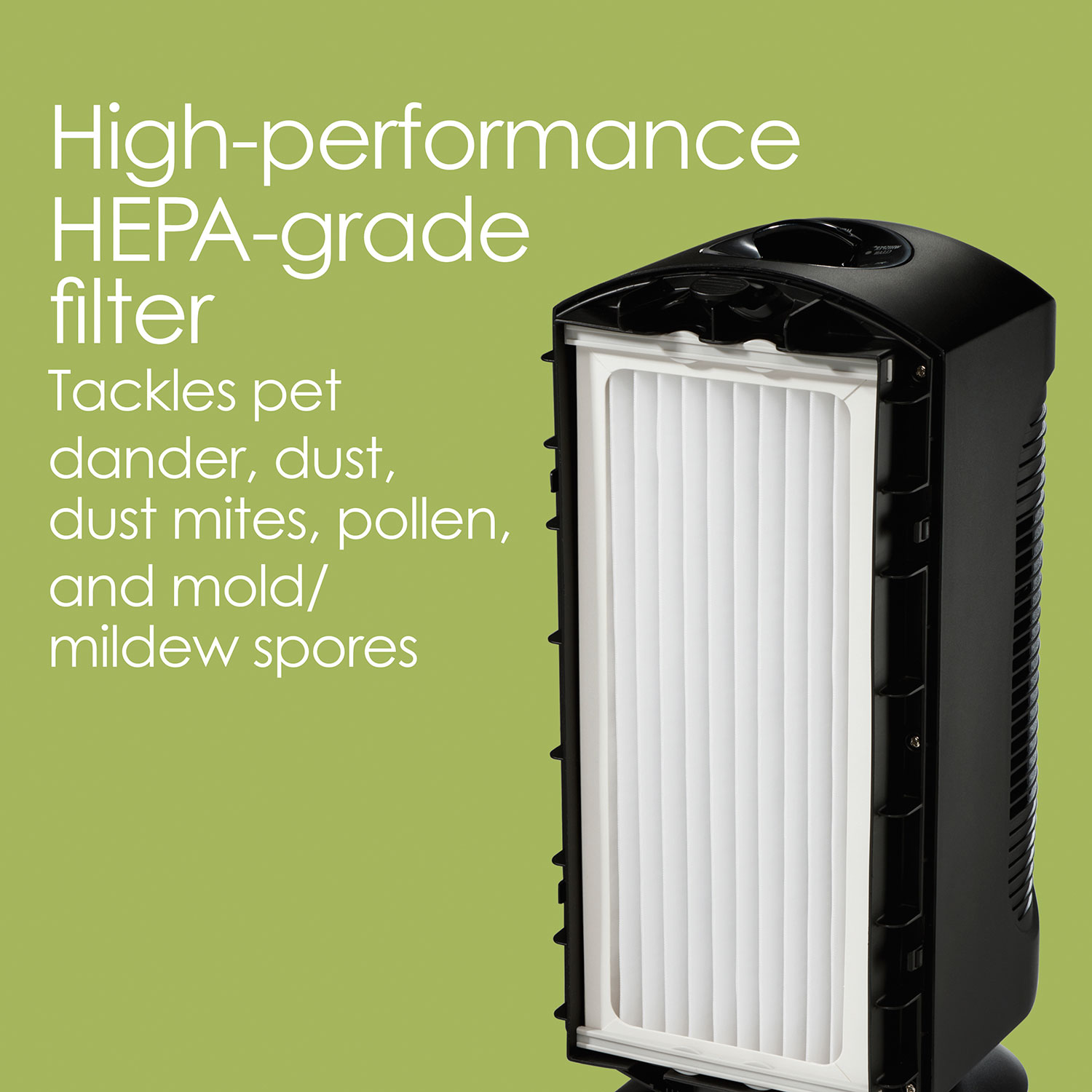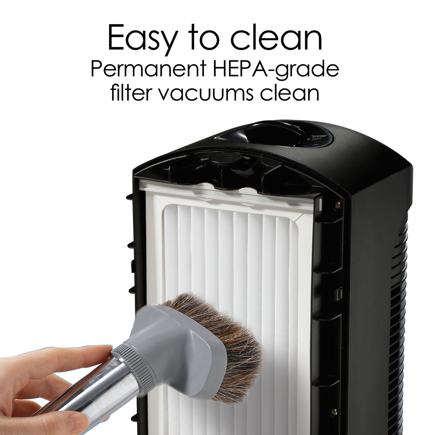 Incluye un filtro tipo HEPA que captura hasta el 99% de partículas como polvo, polen y caspa de mascotas, y puede limpiarse con aspiradora en lugar de reemplazarse