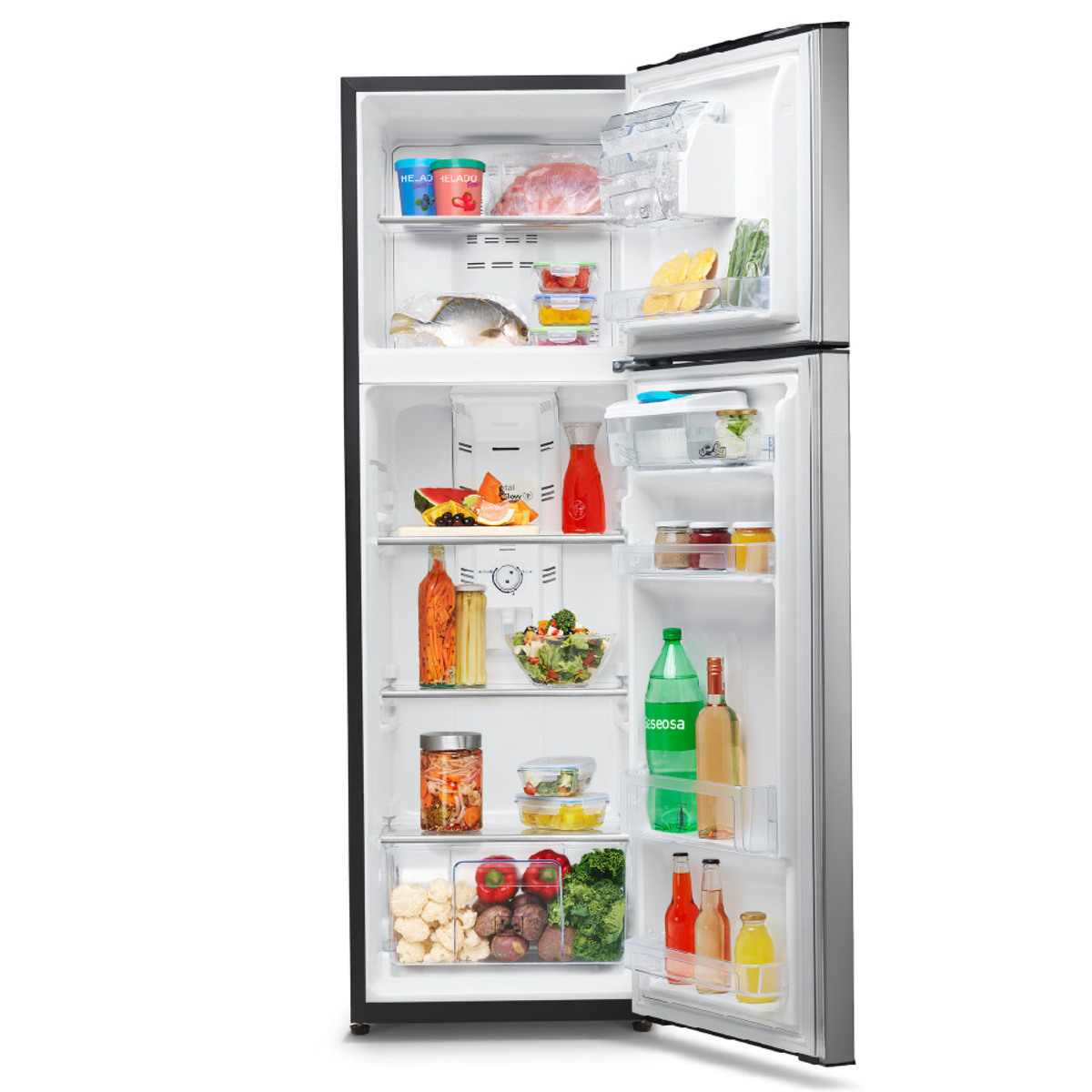 El espacio interior está inteligentemente distribuido con parrillas de alambrón resistentes, compartimentos transparentes para frutas, vegetales y botellas, además de un amplio congelador superior con tapa metálica.