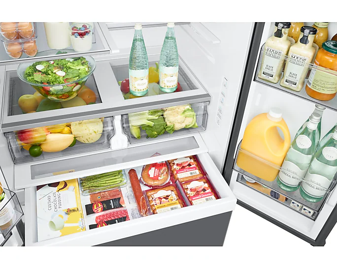 Este refrigerador de 32 pies cúbicos con diseño de tres puertas está pensado para hogares que requieren gran capacidad, orden y una estética moderna. Su distribución interna permite separar mejor alimentos frescos y congelados, facilitando el acceso y mejorando la organización diaria. El acabado negro plateado aporta una apariencia sofisticada que combina con cocinas contemporáneas, mientras que su sistema de enfriamiento asegura un desempeño confiable y constante. Al no incluir dispensador externo, ofrece un frente limpio y mayor aprovechamiento del espacio interior, respaldado por la reconocida durabilidad de Samsung y un compresor diseñado para un uso prolongado.