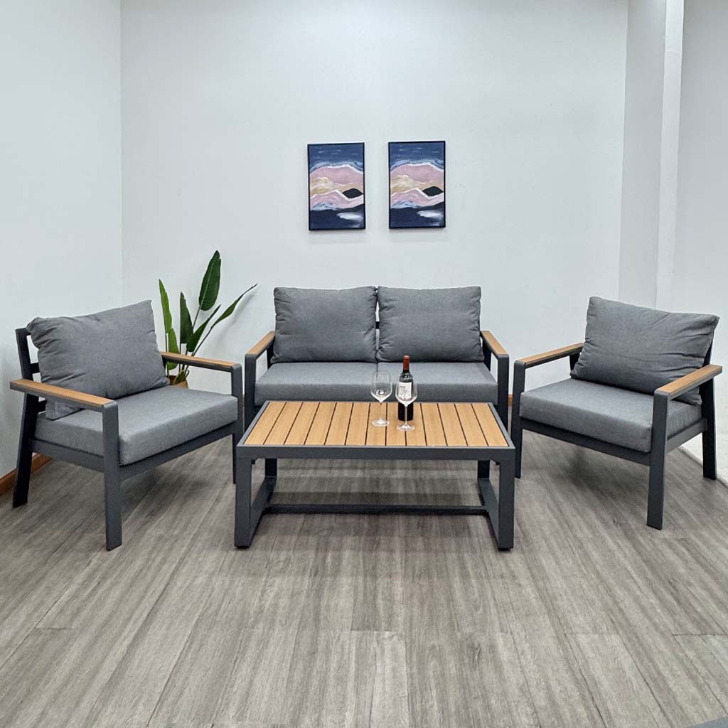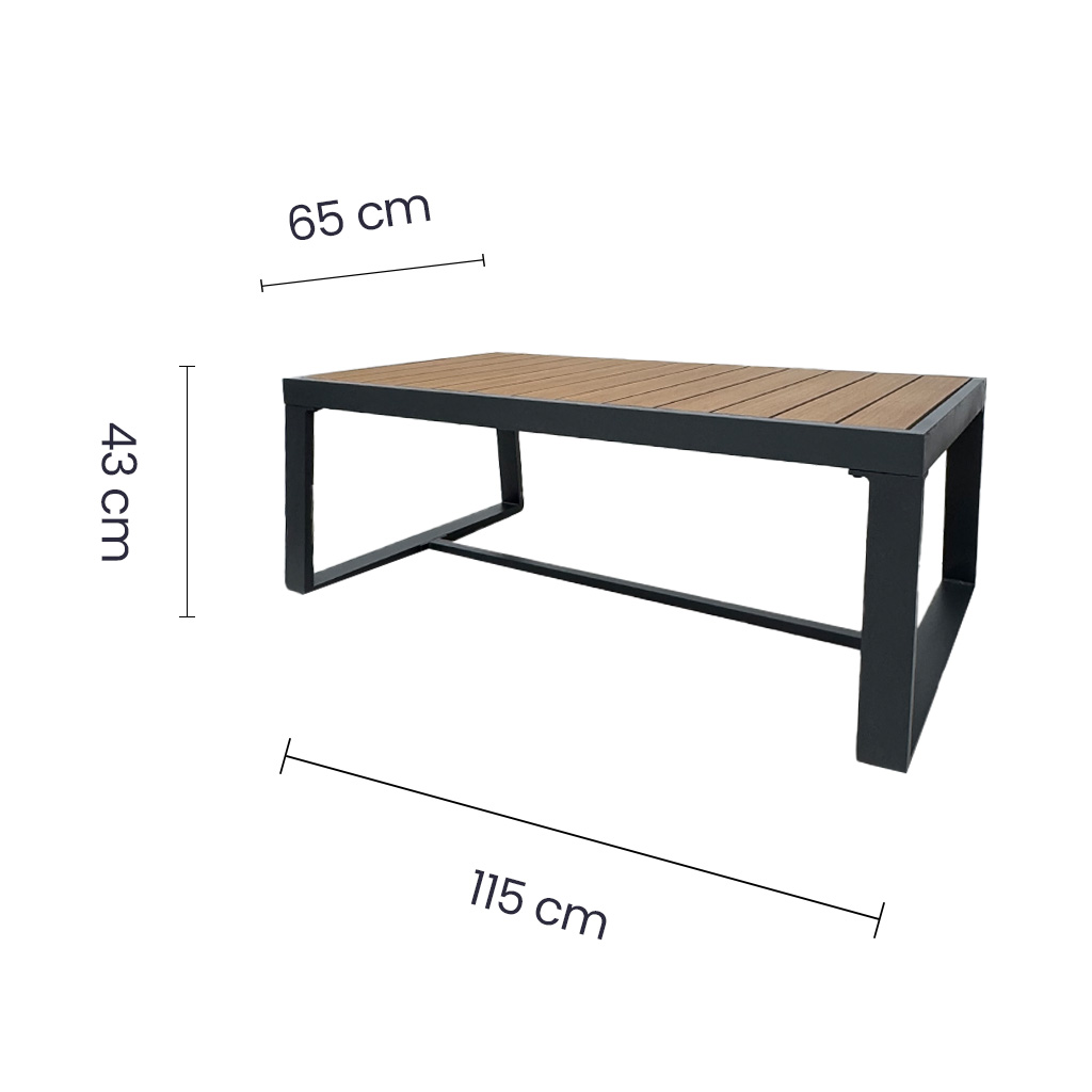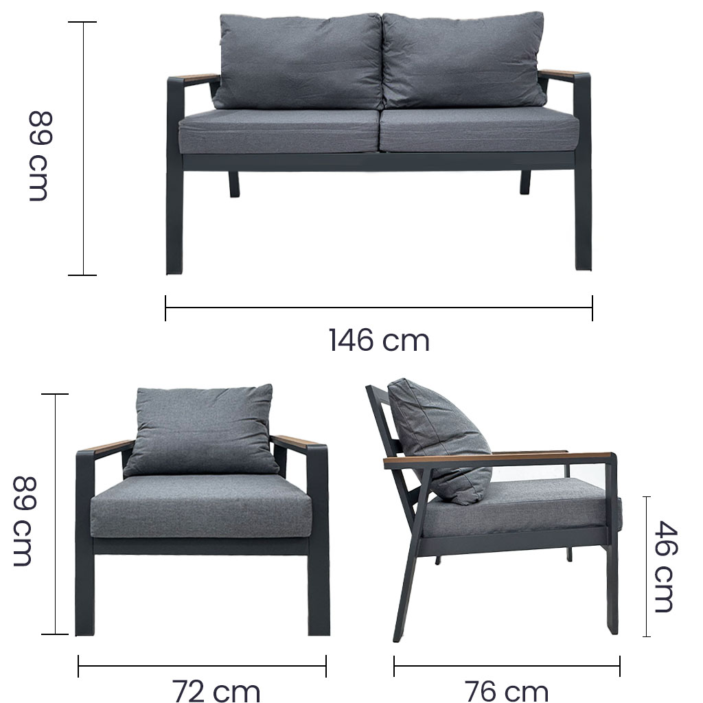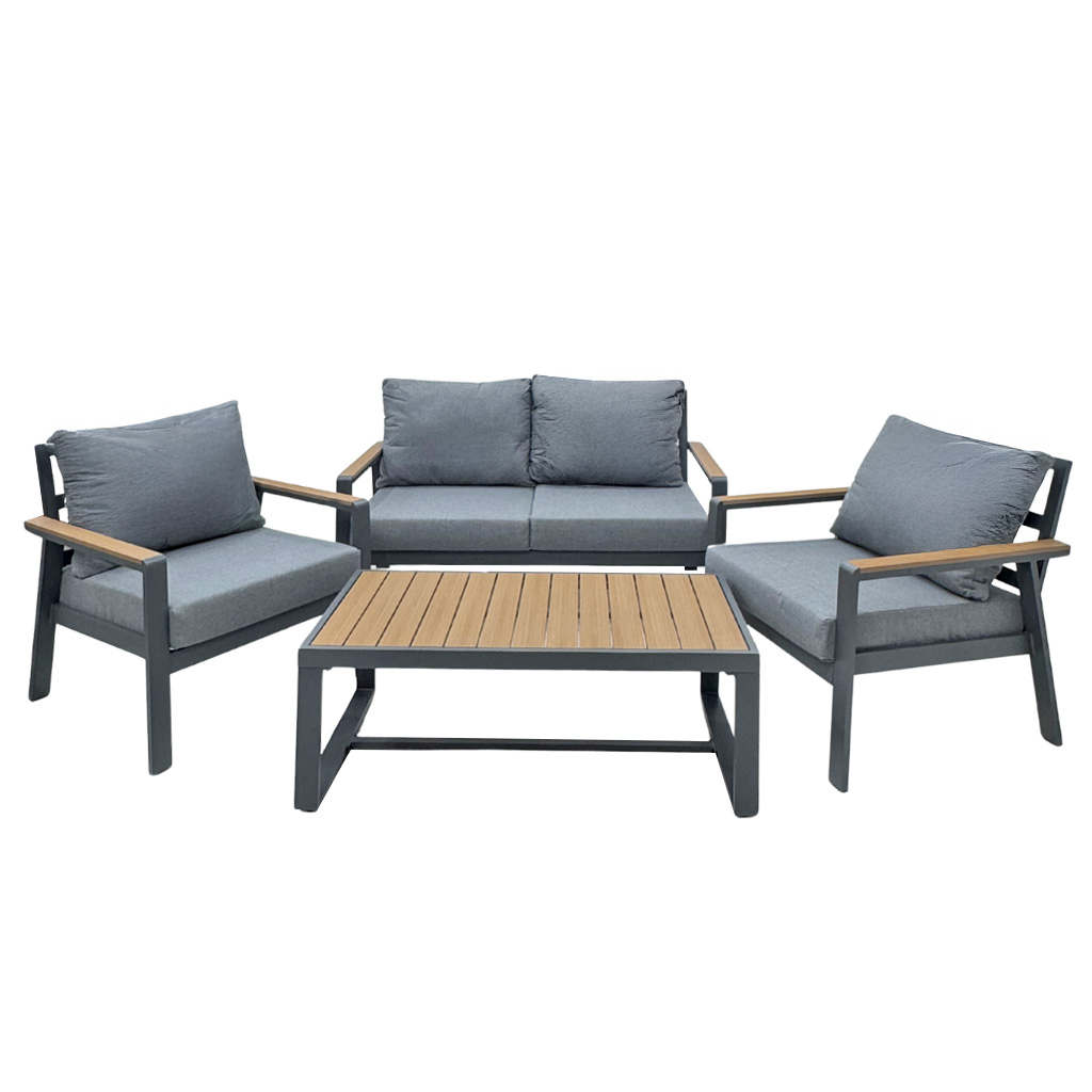 La sala exterior Tokoa EX-7182 ofrece un diseño moderno, resistente y pensado para espacios al aire libre. Su estructura de aluminio proporciona ligereza y alta resistencia a la oxidación, mientras que la madera plástica y la tela sintética garantizan durabilidad incluso en climas húmedos.