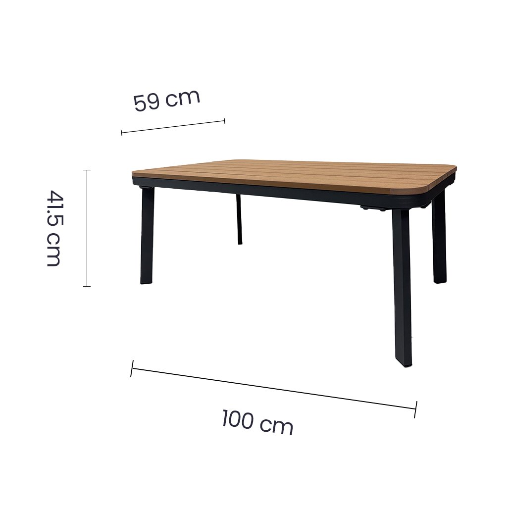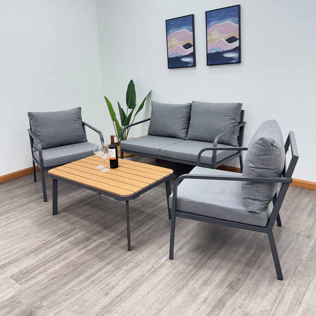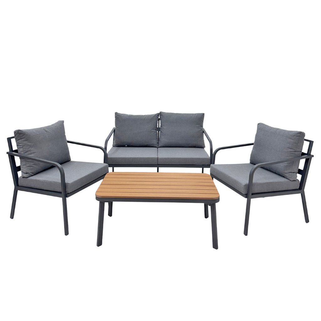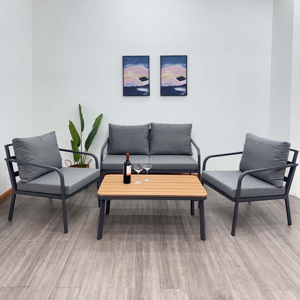 La sala Tokoa EX-7184 ofrece una combinación de diseño moderno, resistencia y confort para espacios exteriores e interiores. Fabricada con aluminio anticorrosivo, madera plástica y tela sintética impermeable, está pensada para durar incluso en ambientes con humedad o sol constante.