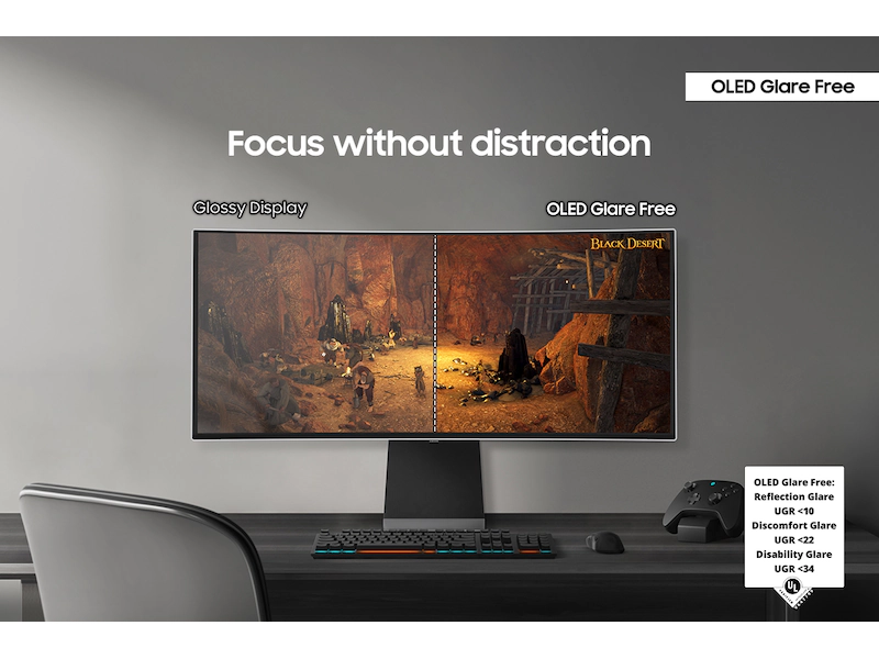Su pantalla curva UWQHD (3440 × 1440) ofrece mayor espacio de trabajo y visión envolvente en juegos, mientras que la tecnología OLED con Glare Free garantiza colores intensos, negros perfectos y ausencia de reflejos.