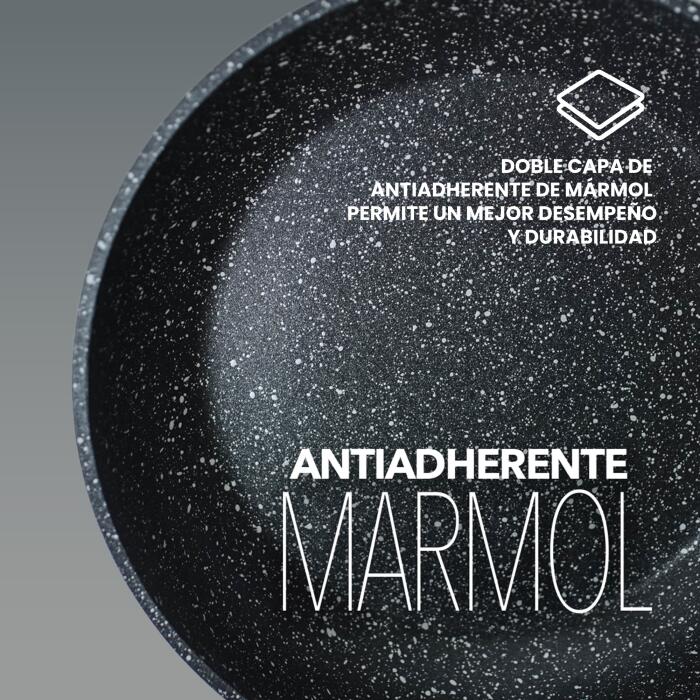 Este modelo Monix de gran diámetro está diseñado para quienes cocinan porciones abundantes y buscan eficiencia sin complicaciones. Su recubrimiento antiadherente de mármol en doble capa ofrece mayor resistencia al uso continuo y una superficie que facilita la cocción uniforme con menos grasa.