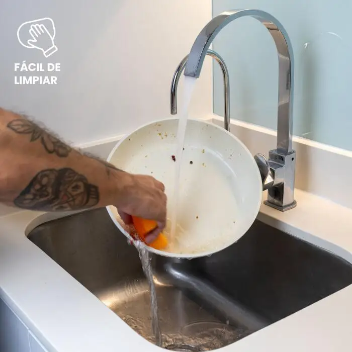 Gracias a su recubrimiento cerámico libre de PFOA, no solo reduce el uso de aceite sino que también facilita la limpieza. Su estructura garantiza una distribución uniforme del calor y resistencia al uso diario.