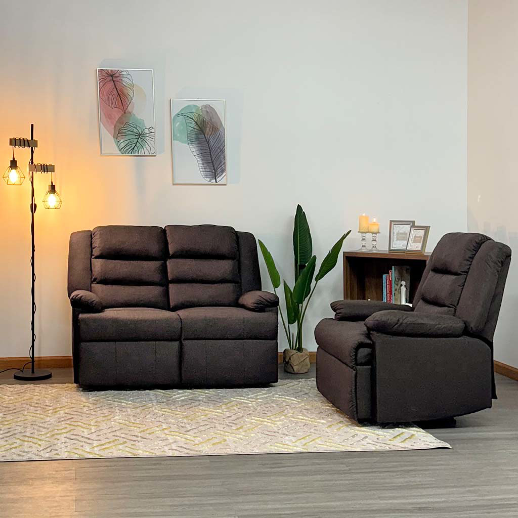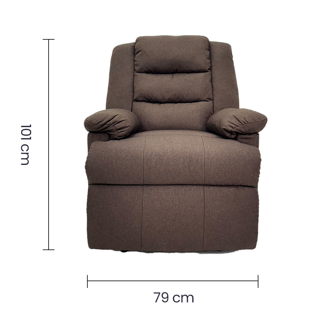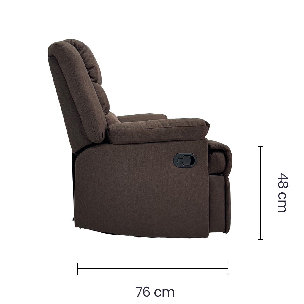 Su tapizado en tela de lino color café oscuro aporta un estilo cálido y sofisticado, mientras que su estructura metálica garantiza estabilidad y durabilidad. El asiento y el respaldar son totalmente reclinables, brindándote la posibilidad de relajarte, leer, o disfrutar de tus programas favoritos con total confort.