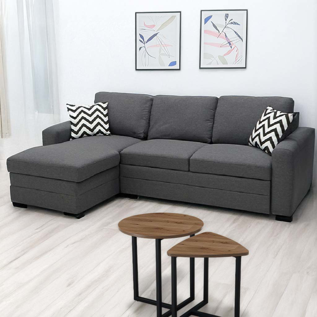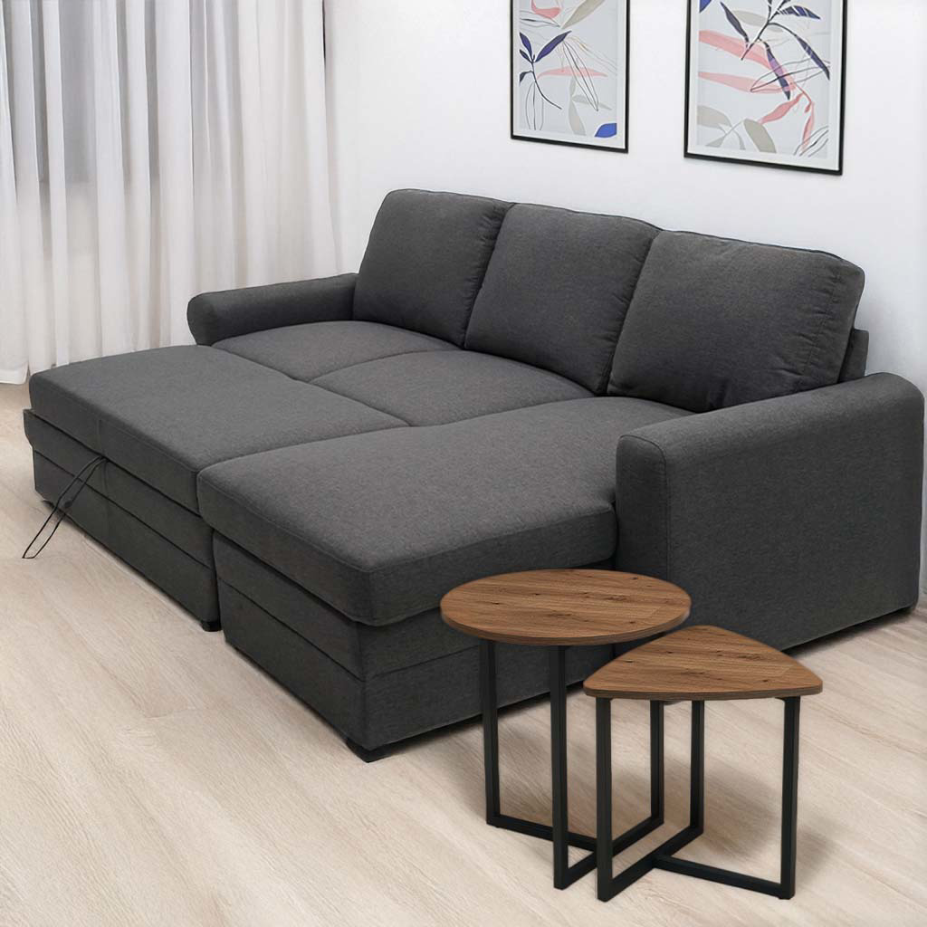 Sofá cama con chaise y baúl de almacenamiento.