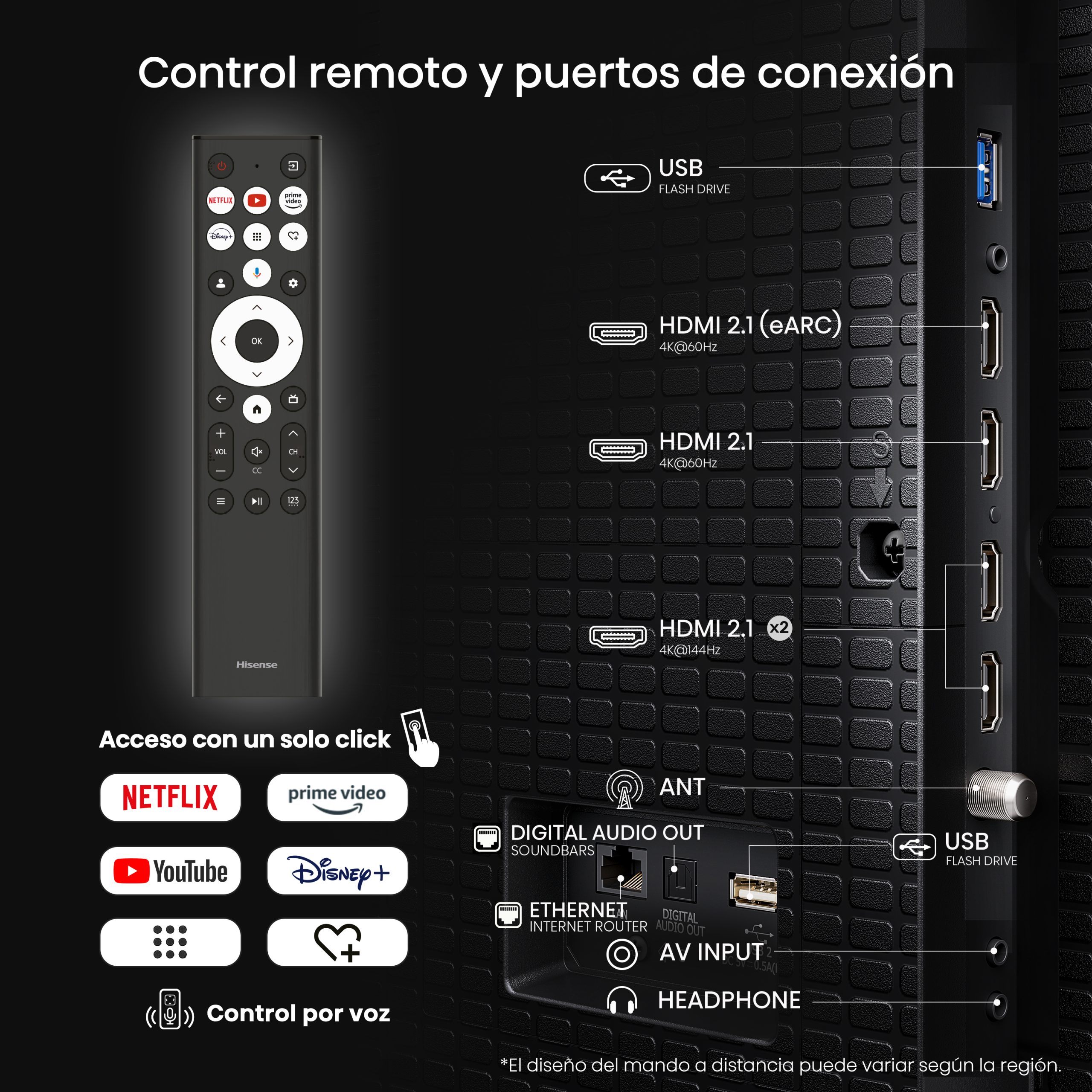 Puertos: 4 HDMI (2×2.1), USB 3.0 + USB 2.0, LAN, Óptico