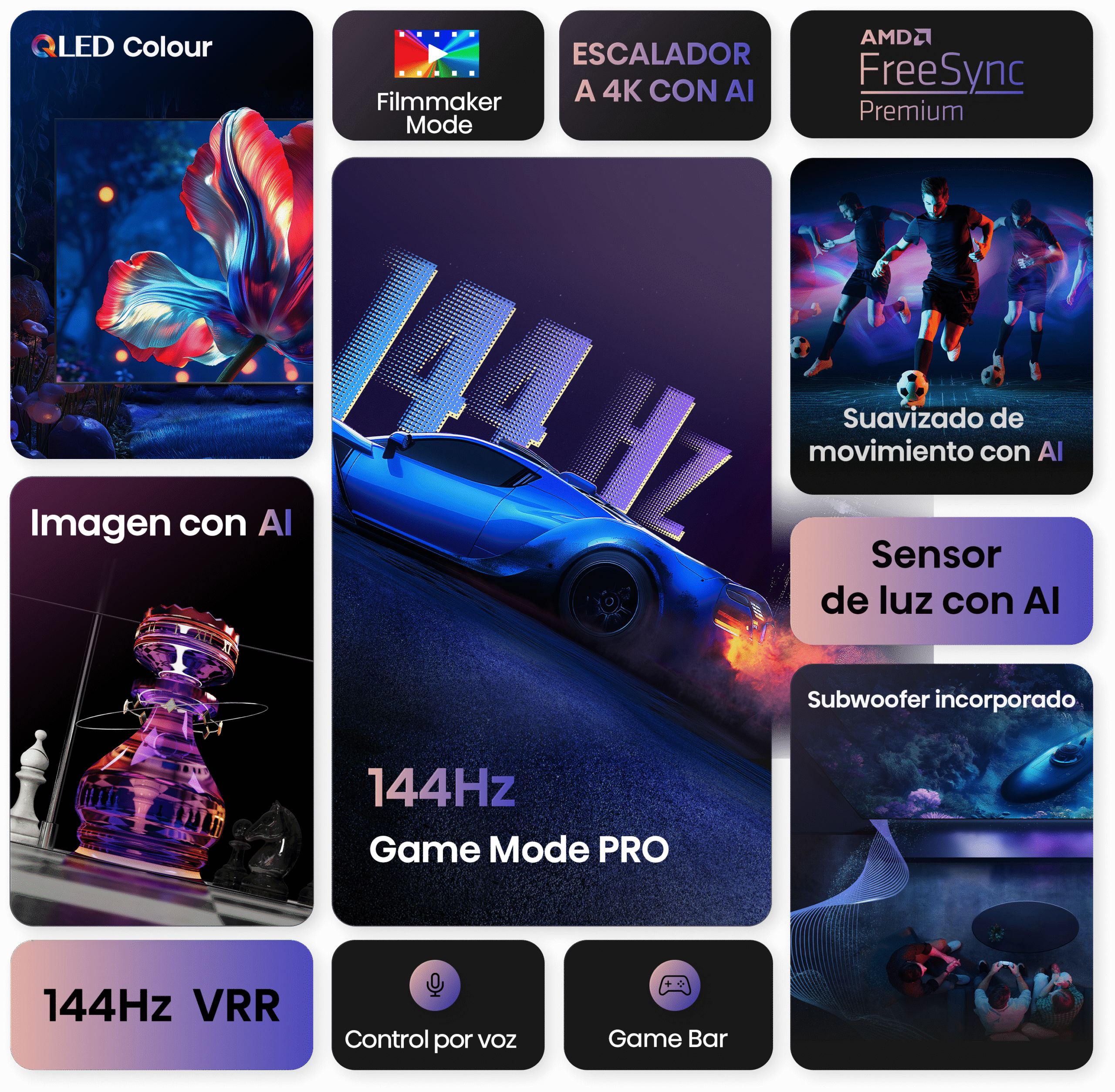 Incluye Dolby Vision para un rango dinámico superior, negros más profundos y reflejos más brillantes. Su modo Game Mode Pro con 144Hz, VRR, FreeSync Premium y latencia baja permite disfrutar videojuegos con fluidez total. Además, integra Google TV con Google Assistant, AirPlay y Chromecast, ofreciendo acceso inmediato a miles de aplicaciones.