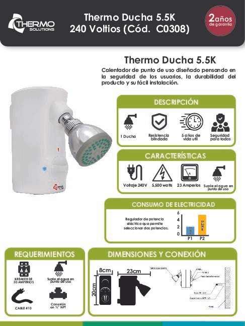 La Thermo Ducha 120 V es un calentador de punto de uso diseñado para brindar agua caliente inmediata, garantizando seguridad, durabilidad y eficiencia energética.
