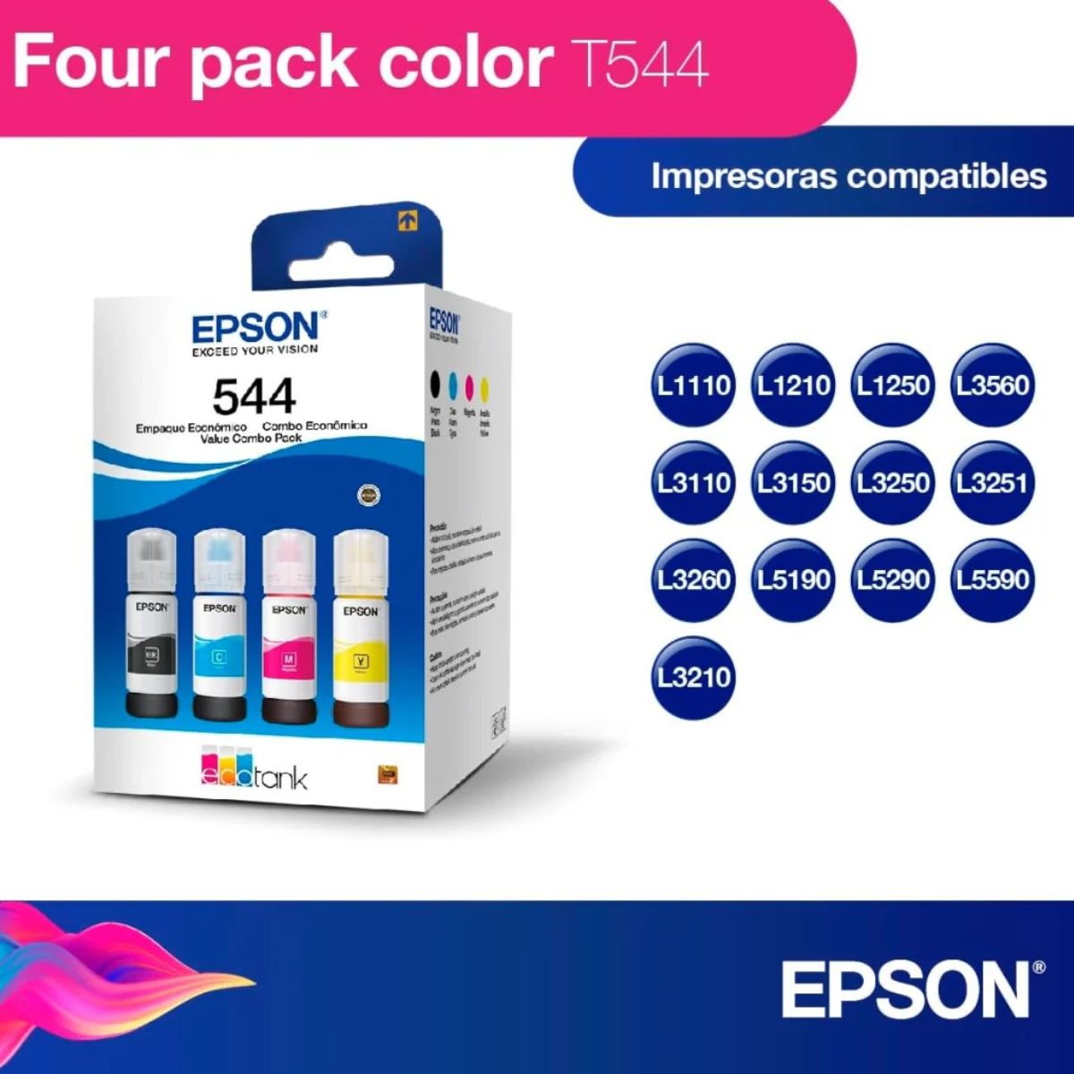 El pack Epson T544520-4P es la solución ideal para mantener tu impresora EcoTank funcionando con máxima calidad de impresión, alto rendimiento y menor costo por página, utilizando tinta original Epson diseñada específicamente para estos equipos.