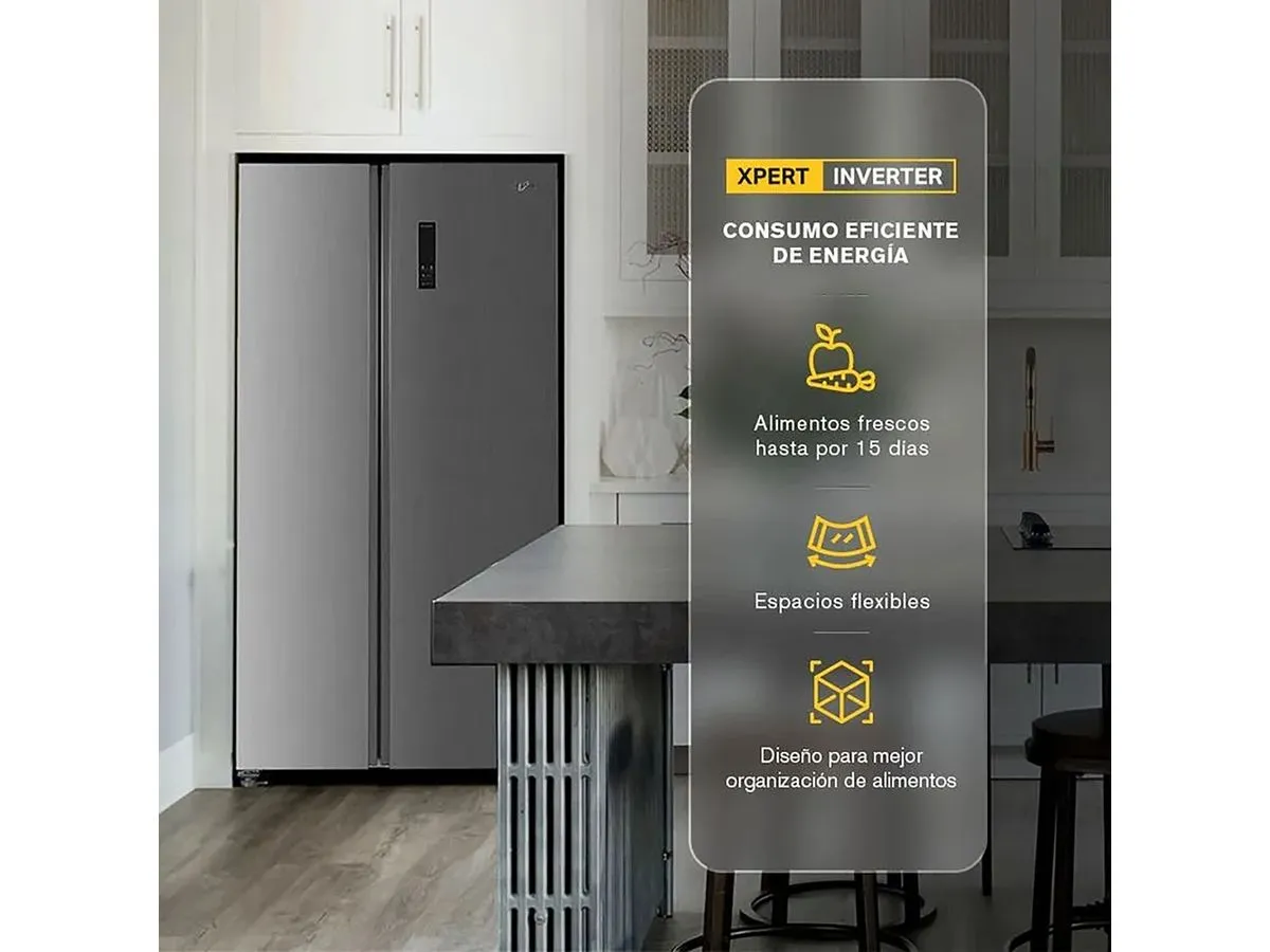 El Whirlpool WD1600S es un refrigerador Side by Side de 18 pies cúbicos diseñado para brindar eficiencia energética, conservación avanzada y máxima organización. Incorpora tecnología Xpert Inverter, que optimiza el desempeño del compresor para mantener temperatura estable, reducir consumo eléctrico y prolongar la vida útil del equipo.